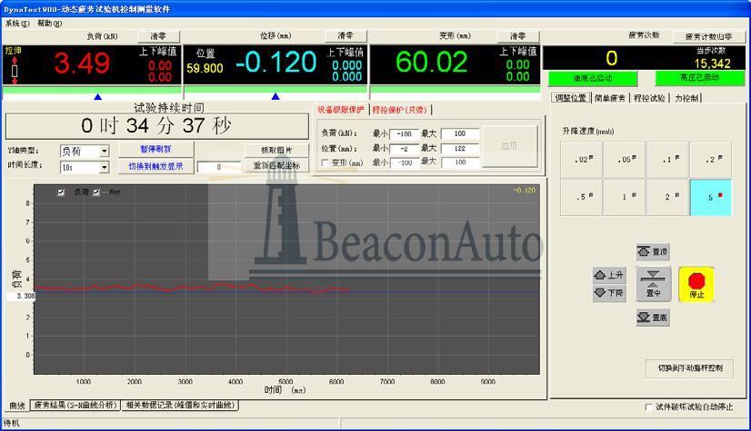 1、主機(jī):主機(jī)為雙立柱框架式結(jié)構(gòu), 100kN伺服直線作動(dòng)器上置于主機(jī)框架內(nèi)部。強(qiáng)迫液壓夾頭分別安裝在橫梁和作動(dòng)器活塞桿頂端。主機(jī)橫梁調(diào)整采用液壓升降、液壓夾緊、彈性松開式結(jié)構(gòu),保證試驗(yàn)過程中橫梁穩(wěn)固可靠,同時(shí)保證在非試驗(yàn)狀態(tài)時(shí)橫梁保持鎖止不動(dòng)。立柱外表面采用電鍍硬鉻處理,可有效增加立柱抗磨損能力,提高防腐蝕能力,同時(shí)增加主機(jī)外形的美觀程度。